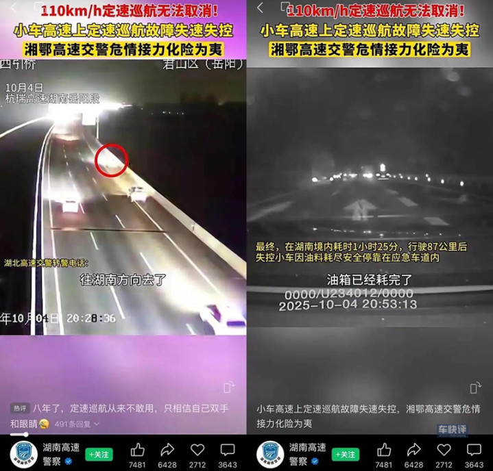 不要误会,这辆在高速上以115km/h时速连续行驶了将近500公里的车,并不是在参加什么比赛,也不是司机故意在秀车技,主要原因还是因为车辆的定速巡航出故障了。