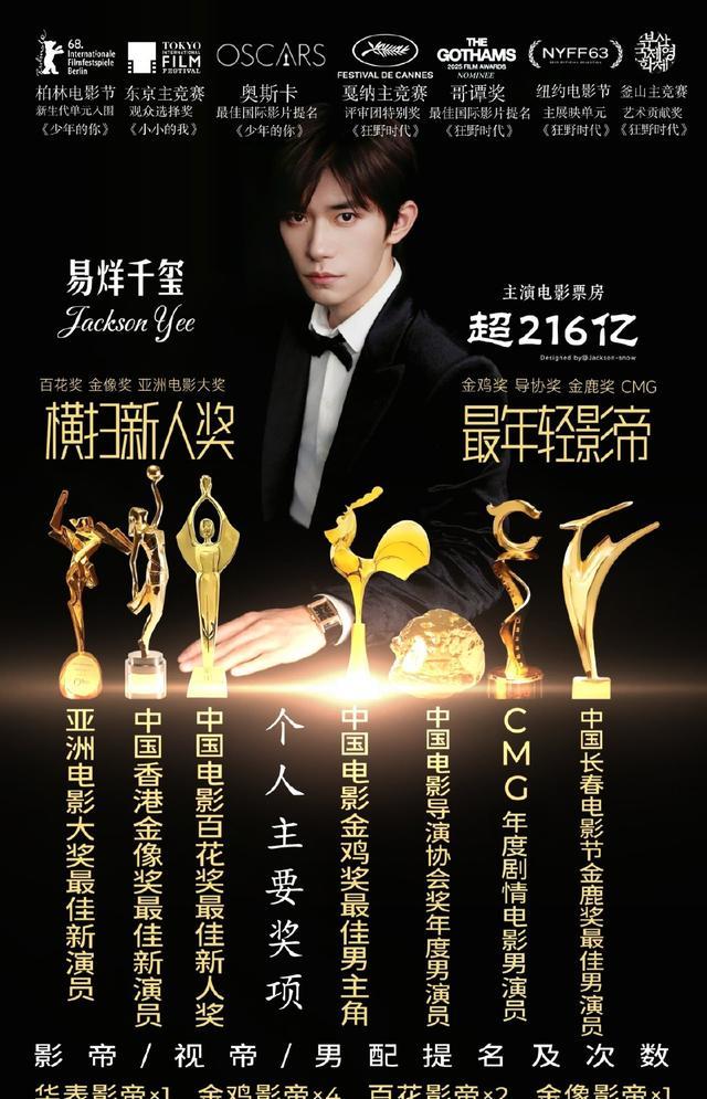 其实很多人都说,易烊千玺能拿到这份荣誉一点都不意外,毕竟这几年他在电影圈交出的成绩单,所有人都看在眼里,公开数据显示,2000年出生的易烊千玺,25岁主演的电影累计票房就已经突破了216亿,是中国影史首位00后200亿票房演员,2024年的时候,24岁的他就凭着《小小的我》里脑瘫少年刘春和的精彩演绎,拿下了金鸡奖最佳男主角,成了金鸡奖史上最年轻的影帝,创下了华语影坛的新纪录。